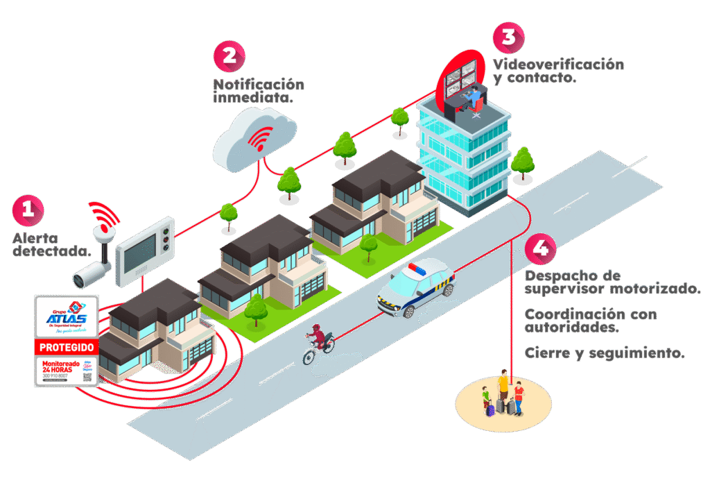 El servicio ofrece supervisión remota 24/7 de equipos de seguridad interconectados, como sensores y alarmas, que envían alertas a una central de monitoreo para prevenir riesgos y proteger hogares o negocios.